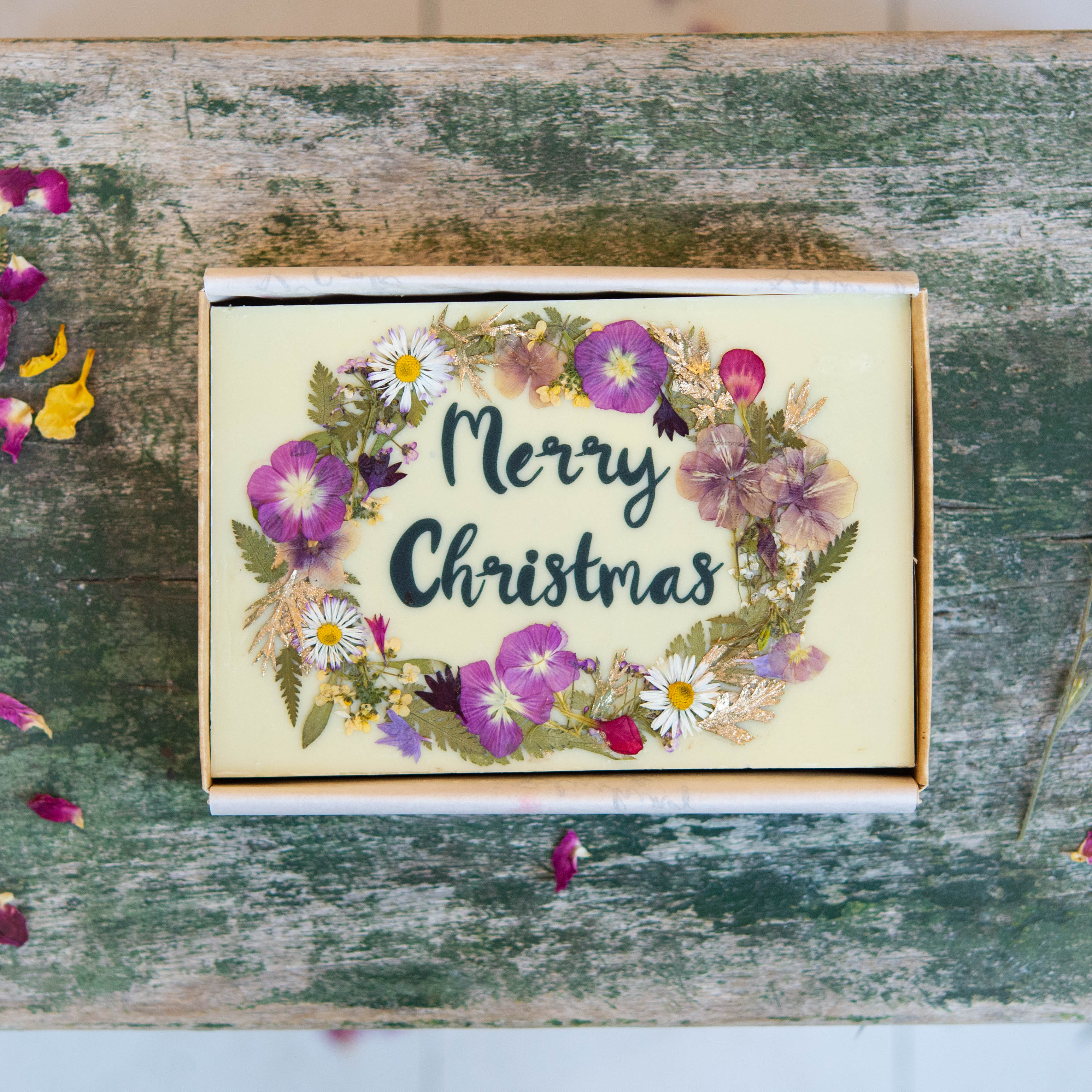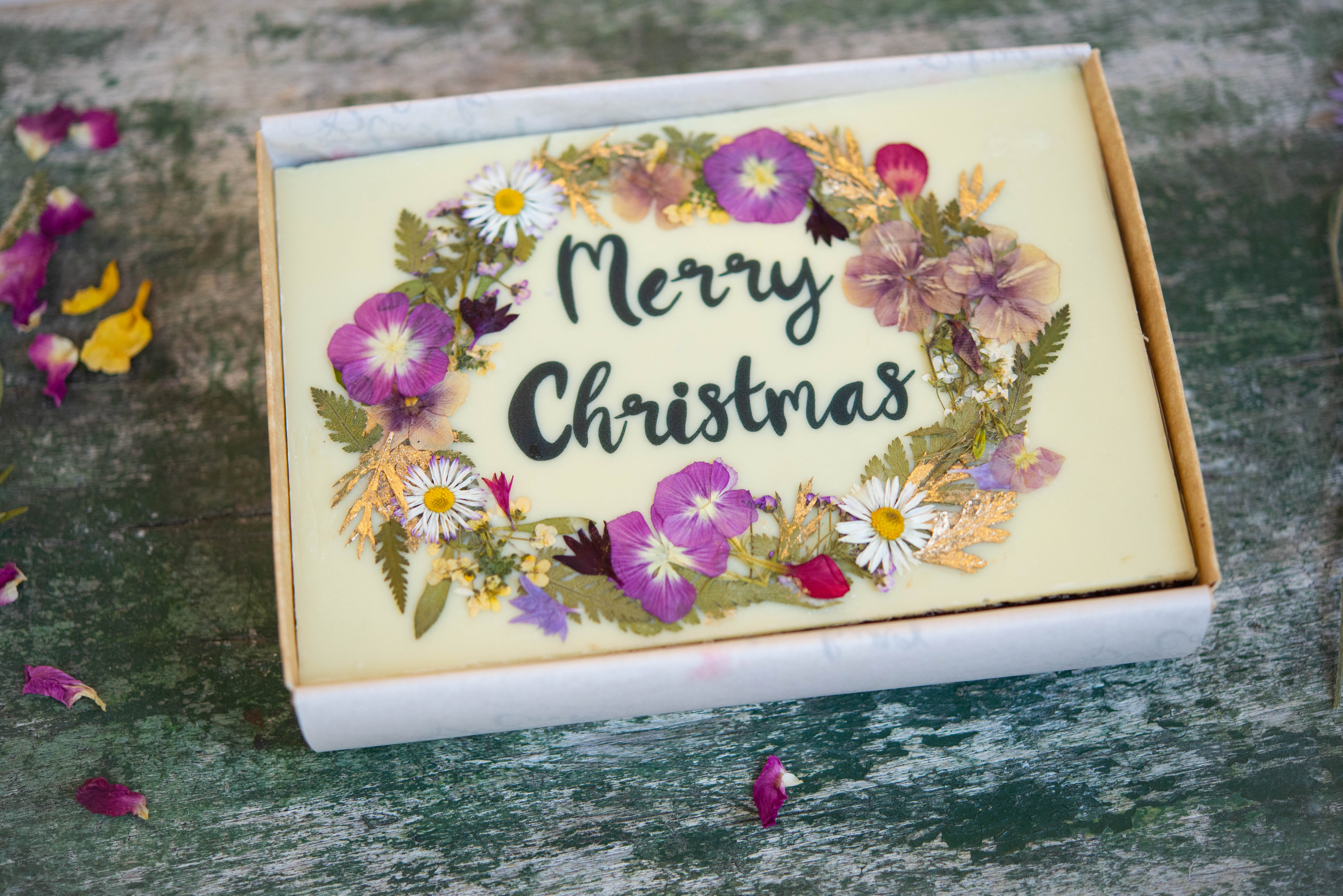 Rich and fudgy, Great Taste Award winning, double chocolate brownies. Topped with a thin layer of white chocolate, a 'Merry Christmas' message and hand decorated with pressed edible flowers.