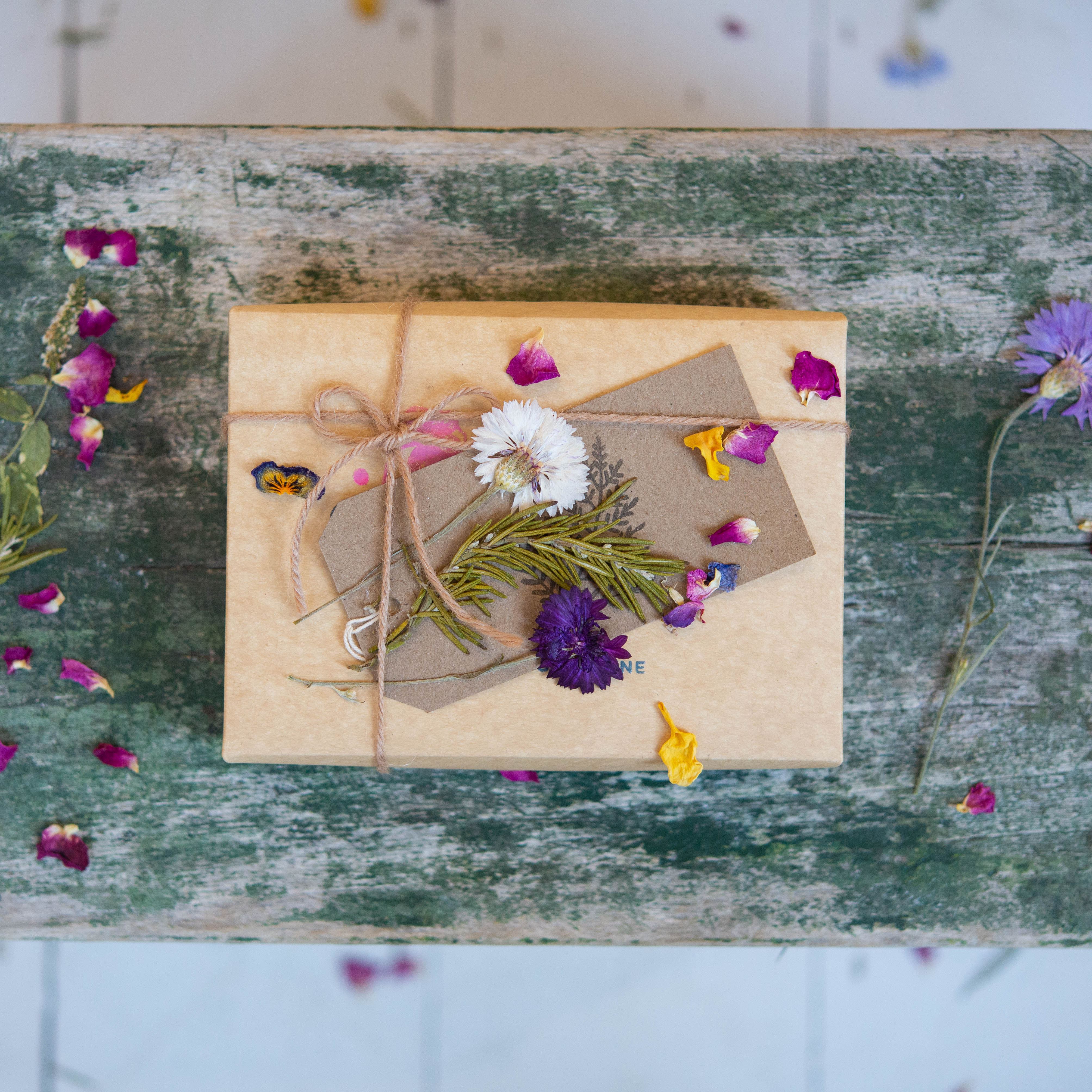 Our floral treats are each presented as a gift we ourselves would wish to receive and one which we want to be a joy from opening the packaging to the first delicious bite.  Each kraft gift box is lovingly hand stamped and tied with twine. With the option to add a kraft gift tag with your personal, handwritten message. This will then be sprinkled with some extra floral love, popped into a protective postal box and slipped into a kraft paper postal bag to ensure they are safe and secure to be posted to yourselves or your recipients.
